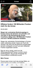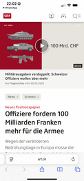Wir haben gute fähige Soldaten, aber keine Ausrüstung. Mit den 100 Mia. werden die dringendsten Lücken geschlossen, der Kampfkern aufgebaut, der Bestand an Soldaten auf 250'000 Soldaten erhöht und die Durchhaltefähigkeit verlängert. Nur mit 100 Mia. Investitionen wird die Schweiz wieder verteidigungsfähig.